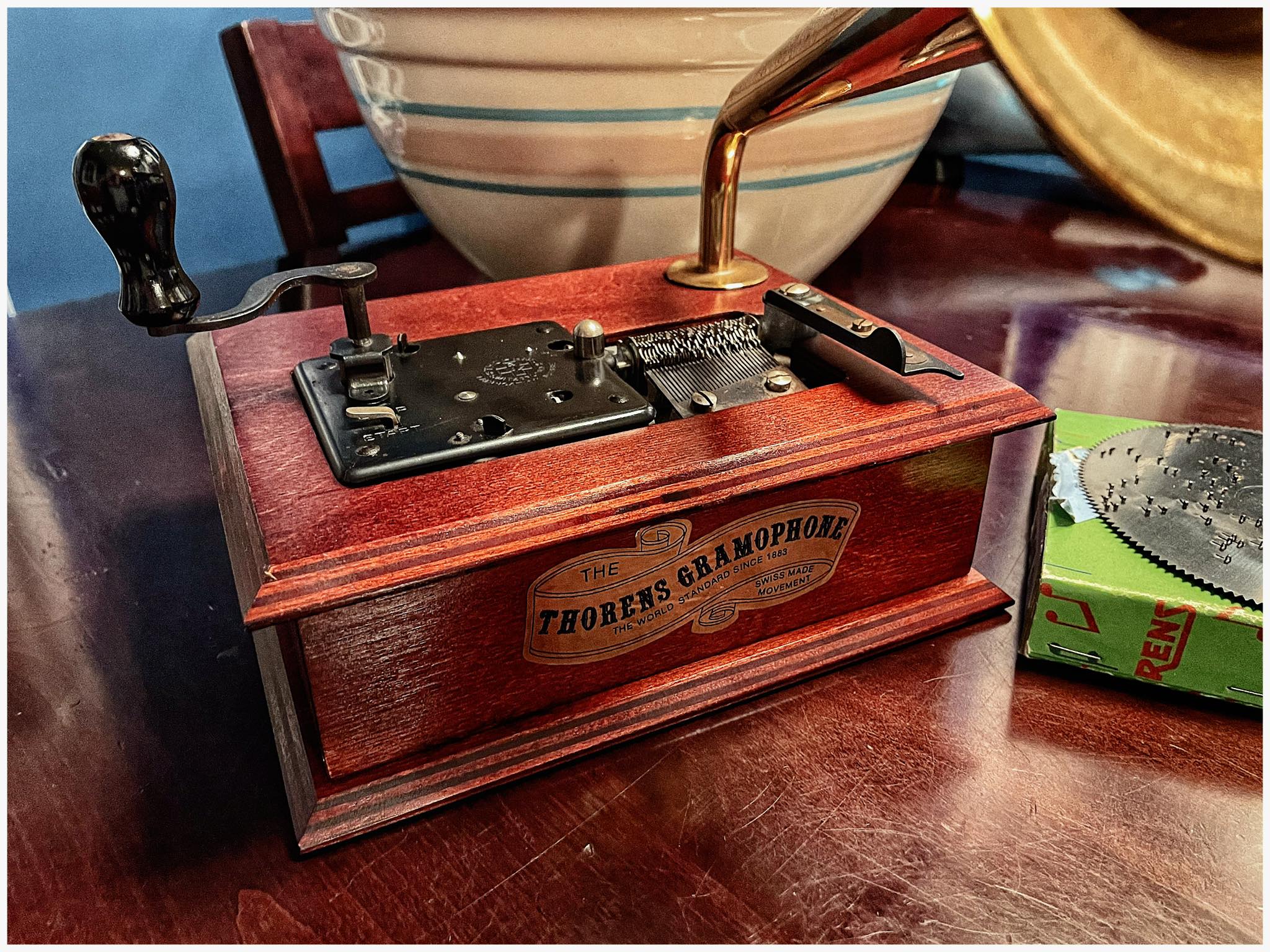 From 1980, a Thorens disc music box made to resemble a gramophone.